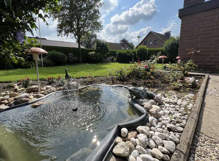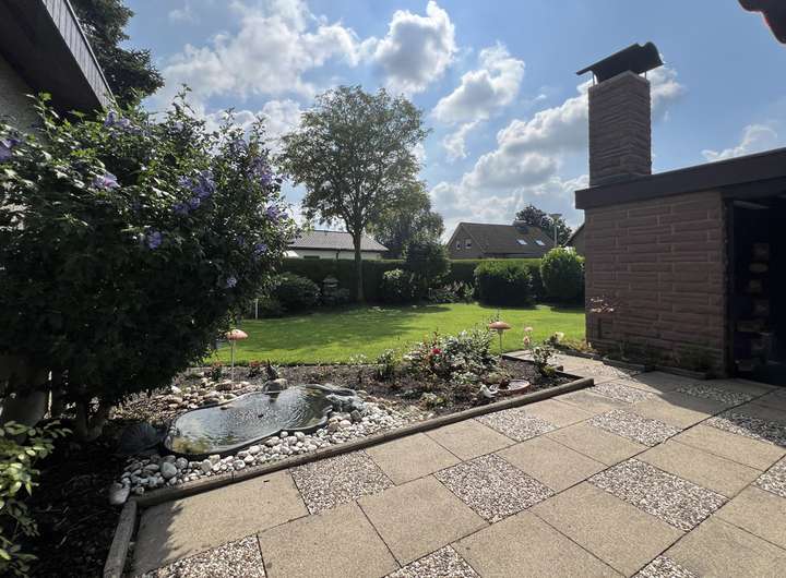 Das Grundstück ist komplett eingefriedet und bietet mit zwei Terrassen und der überdachten Sitzecke mit Außenkamin viel Platz für schöne Stunden im Grünen.