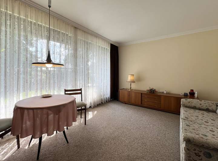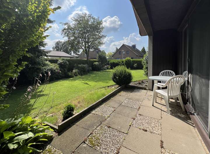 Betreten Sie den Bungalow durch die Haustür, befinden Sie sich im geräumigen Eingangsbereich mit Garderobe und angrenzendem Gäste-WC. Zu Ihrer rechten befindet sich die vollausgestattete Küche mit Zugang zum Hauswirtschaftsraum. Geradezu erreichen Sie das großzügige Wohnzimmer mit Fensterfront zur Südwestterrasse. Von hier aus gelangen Sie in die Abstellräume sowie zur überdachten Terrasse. Bei dem ersten Raum handelt es sich um die ehemalige Garage, welche wohnlich ausgebaut wurde. Eine Umnutzung zu Wohnraum kann über das Bauamt beantragt werden.