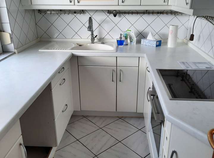 Die komplette Einbauküche mit Kühl-Gefrierschrank und Backofen gehört zum Kaufumfang.