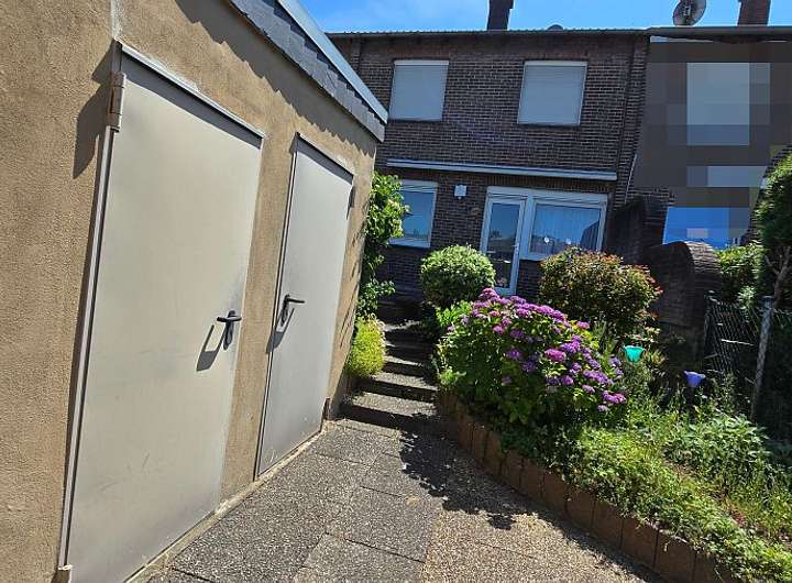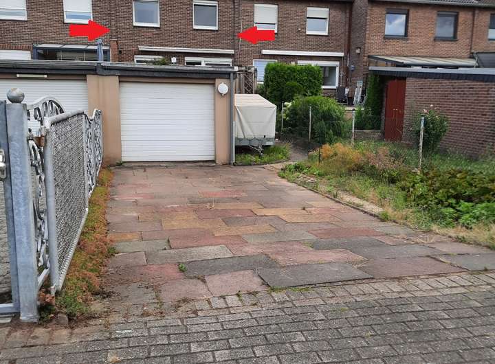 Das Haus ist auch von hinten anzufahren. Dort befindet sich auf dem Grundstück auch die Garage und ein evtl. zwei Stellplätzen davor. Die Garage hat noch eine hintere seitliche Tür.
