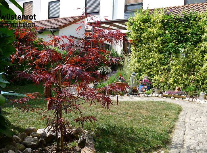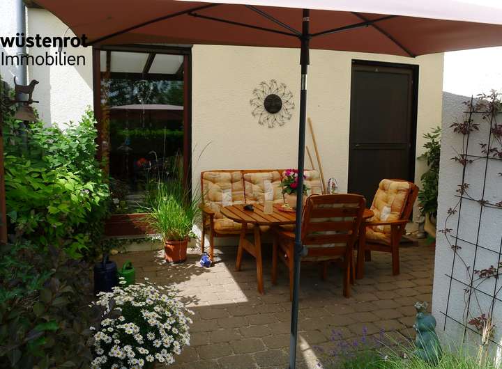 Die überdachte 12 qm große Terrasse garantiert Grillvergnügen auch bei wechselhaftem Wetter. Gartengeräte, Terrassenmöbel und noch einiges mehr sind im direkt angrenzenden Gartenhaus bestens untergebracht. Das Grundstück kann auch über einen Fußweg von hinten begangen werden.