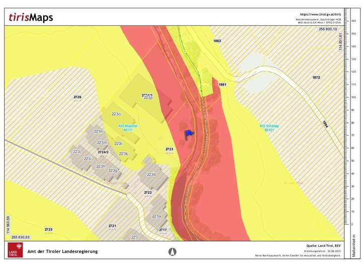 Durch die unmittelbare Nähe zum Bach ist das Grundstück mit Teilen in der roten, bzw. gelben Zone. Es ist somit bei der Bebauung auf die wasserrechtliche Situation Rücksicht zu nehmen. Der zuständige Raumplaner hat sämtliche Bebauungsmöglichkeiten bereits im Vorfeld abgeklärt, es können bei konkretem Interesse gerne weitere Unterlagen zur Verfügung gestellt werden.
