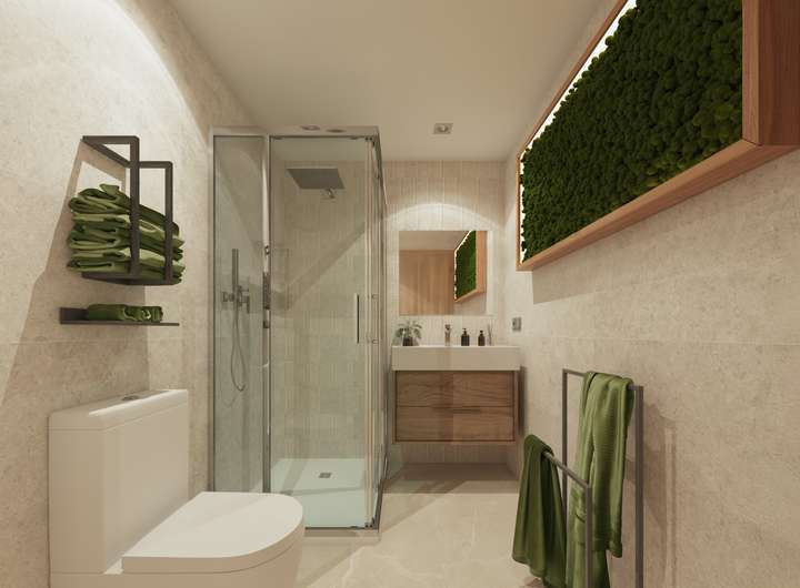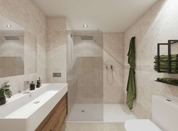 • Voll ausgestatteten Bädern mit Möbeln, Spiegel und Duschabtrennung.
