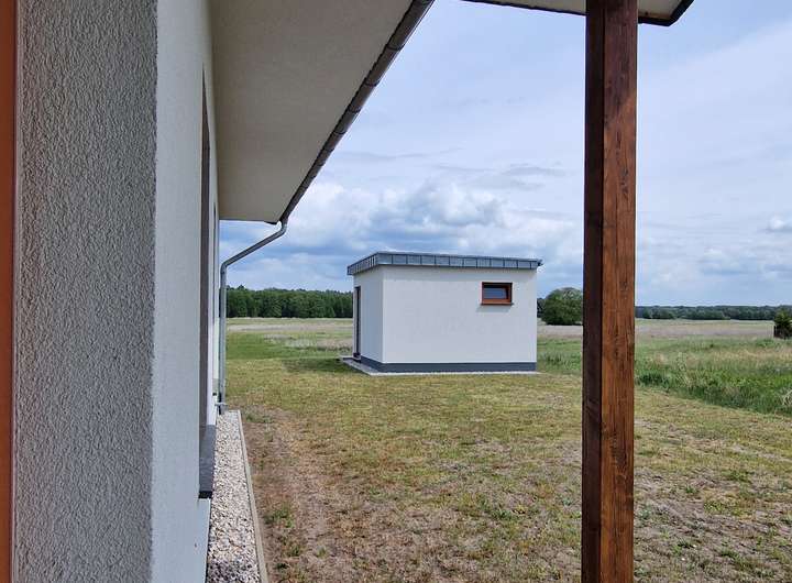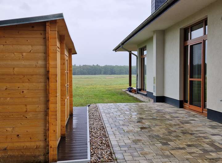 Die Terrasse des Hauses ist wunderbar in den Baukörper integriert, und lädt Sie zum Relaxen und Genießen dieses Ausblicks ein. Bei Sonne und Regen gleichermaßen. Ein interessantes "Nebengebäude" wurde bewusst aus dem Blick zum Wald genommen und wird derzeit als Homegym genutzt. Es ist ein massives "Nebengebäude" , welches auch eine ganz andere Funktion erhalten kann. Auf dem Grundstück wurde außerdem ein Gartenhaus aus Massivholz errichtet und komplettiert den hohen Wohnkomfort an diesem Ort.
