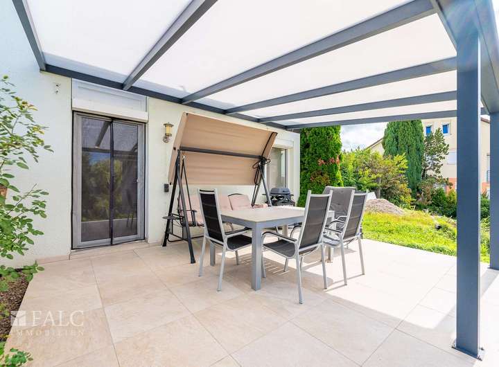 Vom Wohnbereich gelangen Sie auf die großzügige, von der Sonne verwöhnte Terrrasse. Hier können Sie den Grill anwerfen und den Abend mit einem guten Tropfen ausklingen lassen.