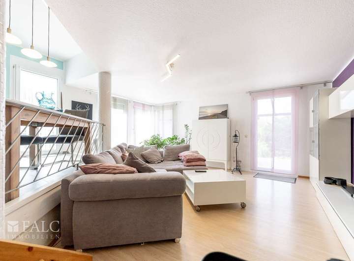 Im Wohnbereich, der vom Essbereich durch ein paar Stufen getrennt ist, entspannen Sie nach getaner Arbeit.
