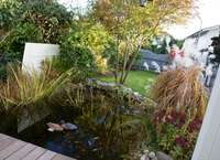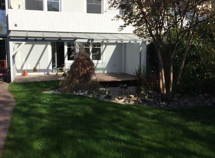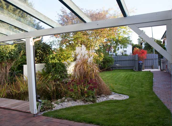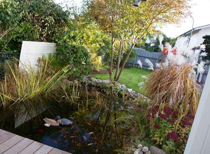 Sonniger Garten mit Teich: Der liebevoll angelegte Garten mit überdachter Terrasse und idyllischem Teich bietet eine Oase der Ruhe – ideal für Kinder, Naturfreunde und gemütliche Abende im Freien.