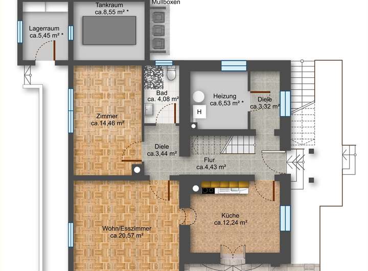 - Teilunterkellerung (unter der Treppe)