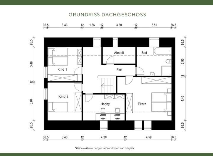 Über eine geschlossene Holztreppe gelangt man ins Obergeschoss des Hauses. Hier befinden sich drei weitere Zimmer, ein kleiner Hobbyraum, ein Abstellraum sowie ein großzügiges Badezimmer, das sowohl mit einer Dusche als auch mit einer Badewanne ausgestattet ist. Das Obergeschoss wurde in den 1980er-Jahren in Eigenleistung ausgebaut und ist derzeit nicht offiziell als Wohnfläche eingetragen. Es erfüllt jedoch alle baulichen Voraussetzungen für eine vollständige Anrechnung als Wohnfläche und kann durch einen Architekten entsprechend nachträglich deklariert werden.