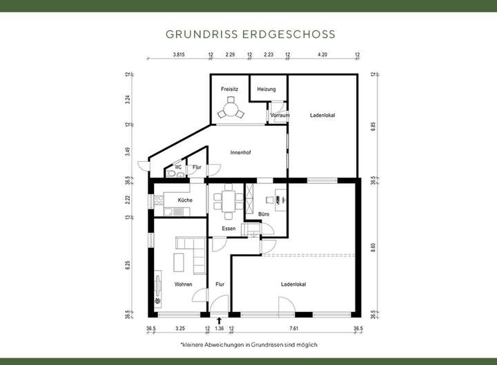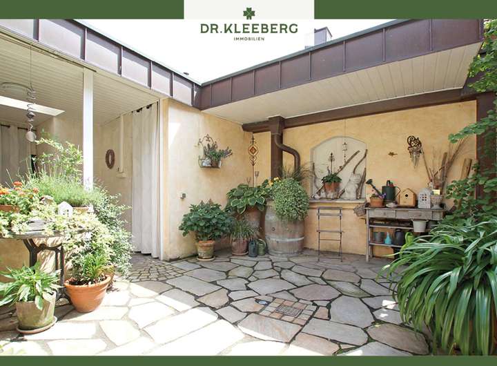 Angrenzend an den Küchenbereich führt ein Durchgang zu einem Gäste-WC sowie zum liebevoll gestalteten Innenhof mit geschlossenem Freisitz. Dieser geschützte Bereich ist uneinsehbar und lädt insbesondere in den Sommermonaten zum Entspannen und Verweilen ein. Rechts des Esszimmers liegt die sogenannte Upkammer, in der sich ein kleines, ruhiges Büro befindet.