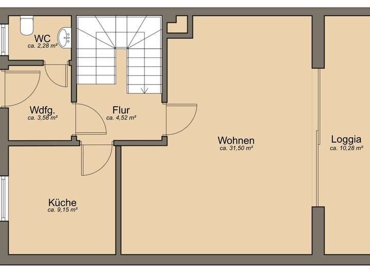 Im Erdgeschoss (Hochparterre) erwarten Sie ein Windfang, ein modernisiertes Gäste-WC (2019), eine Küche mit Einbauküche sowie ein großzügiger Wohn- und Essbereich mit Zugang zur sonnigen Loggia mit Süd-Ost Ausrichtung.