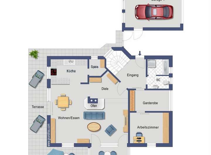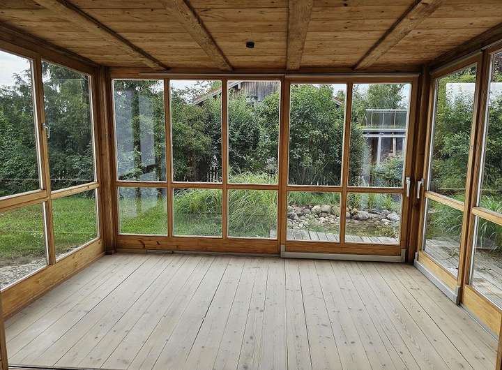 Im EG befindet sich der Eingangsbereich mit einem Tageslichtbad, ein Durchgangszimmer, welches als Garderobe genutzt werden kann, ein Arbeits-/Gäste-/Zimmer, ein großzügiger, heller Wohnraum mit Grundofen und offener Küche (ohne EBK) und angrenzender Speisekammer. Der Wohnraum bietet Zu-gang zum Wintergarten, der Holzterrasse und zum Garten.