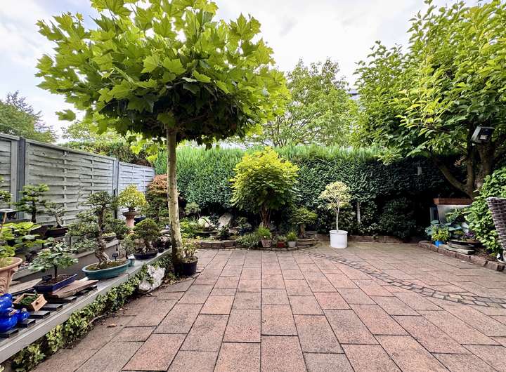 Pflegeleichter Garten – größtenteils gepflastert, mit umlaufender Begrünung als grüner Rückzugsort