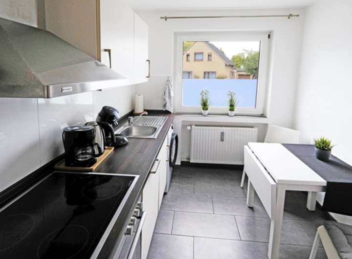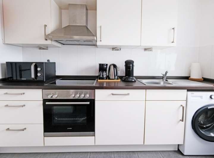 Die Küche ist voll ausgestattet: EBK mit Backofen, Ceranfeld, Dunstabzug, Kühlschrank, Mikrowelle, Geschirrspüler, Geschirr + Besteck, Töpfe und Pfannen, Kaffeemaschine, Wasserkocher, Waschmaschine)