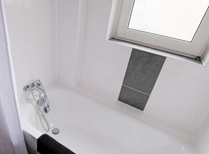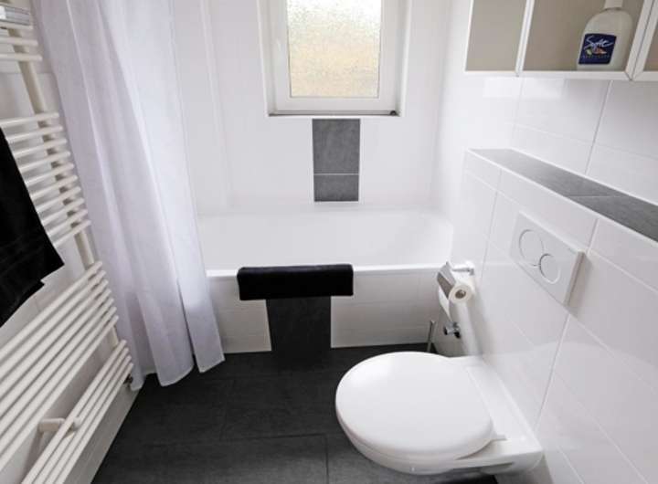 Das Badezimmer ist mit einem WC, Badewanne mit Duschmöglichkeit, Waschbecken ausgestattet. Helle moderne Fliesen und ein Fenster zum lüften.
