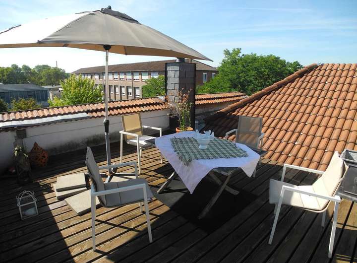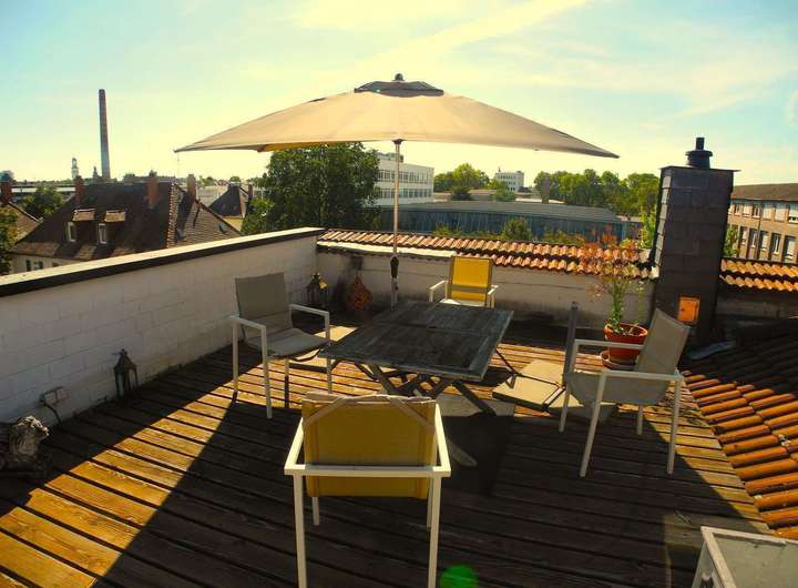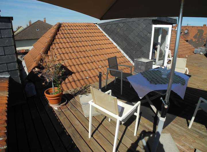 Große einmalige Dachterrasse mit Rundumblick über die Stadt und in die Pfalz.