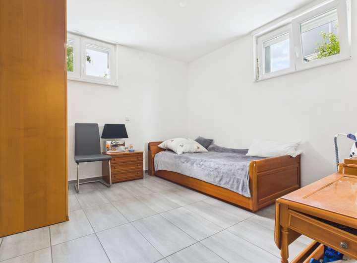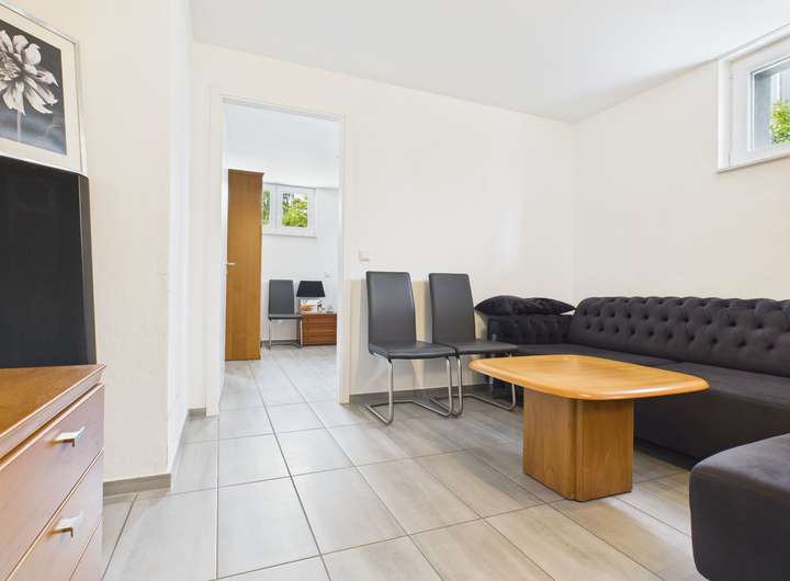 -Kellergeschoss (ca. 65 m²): 2 Schlafzimmer, Wohnzimmer mit Küche, Bad, Abstellraum – vollständig als Wohnung ausgebaut