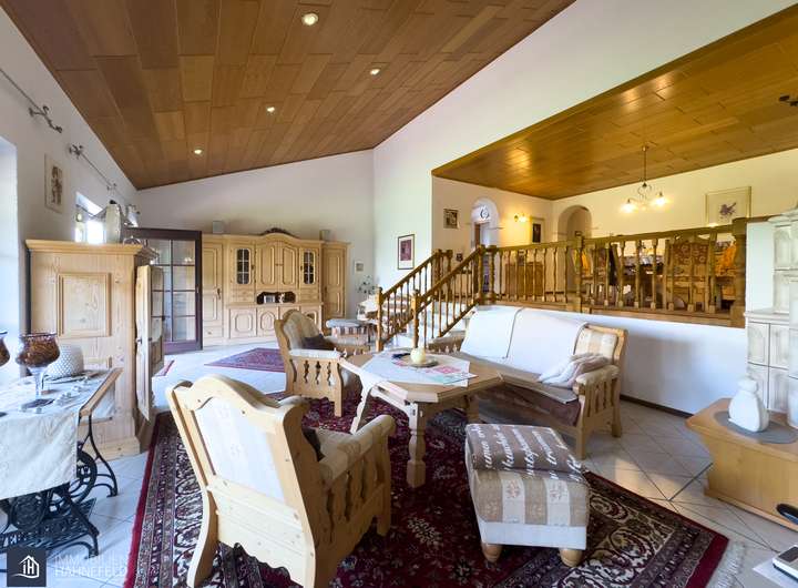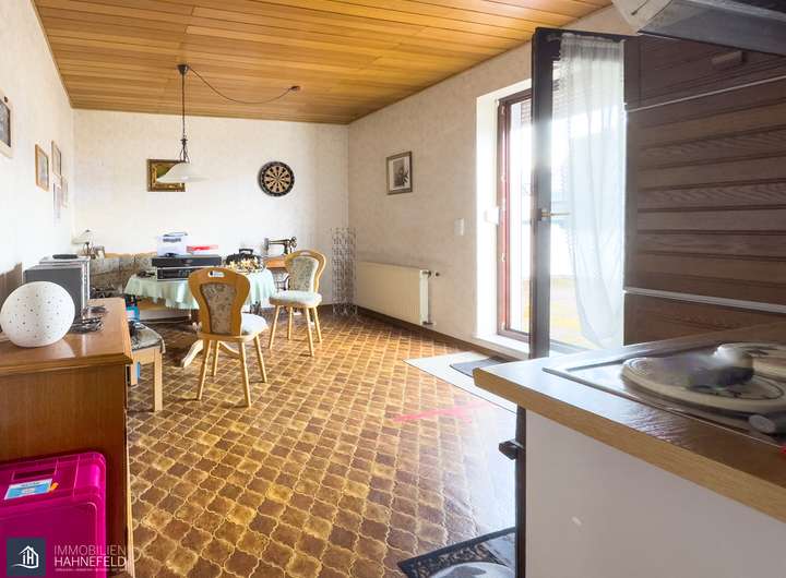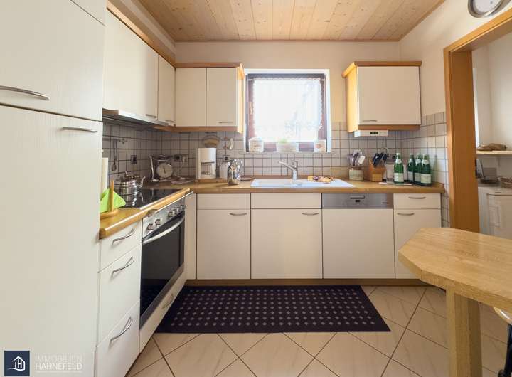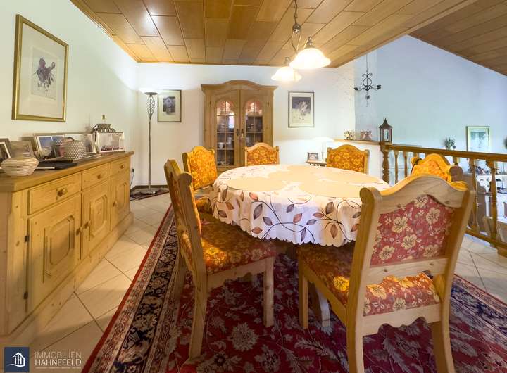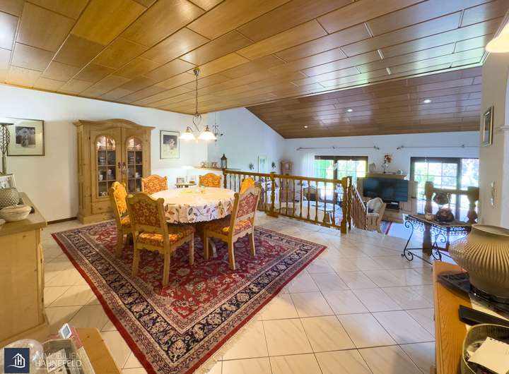 Der Anbau beherbergt das lichtdurchflutete Esszimmer – den zentralen Lebensmittelpunkt des Hauses. Von hier geht es in die gepflegte Küche mit moderner Einbauküche und angrenzender Speisekammer. Über ein paar Stufen erreicht man das versetzt angelegte Wohnzimmer mit hoher Decke und direktem Zugang zur überdachten Terrasse und dem liebevoll angelegten Garten mit gepflegtem Baumbestand und blickdichter Bepflanzung.