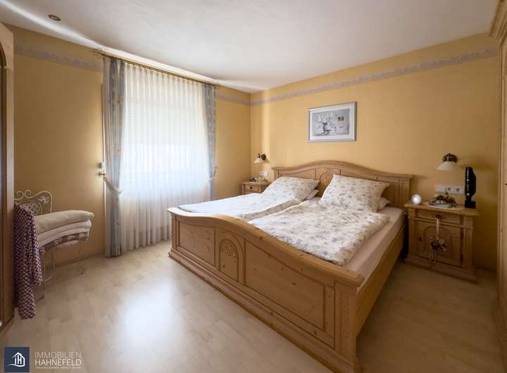 Über das mit einem schönen Holzgeländer versehene Treppenhaus gelangt man in das 1. Obergeschoss. Hier erwarten Sie ein weiteres großes Schlafzimmer, eine zweite Küche mit Zugang zur Dachterrasse sowie ein weiteres modernisiertes Bad mit Dusche und Waschtisch. Die Dachterrasse bietet einen herrlichen Blick in den Garten und lädt zum Verweilen ein.
