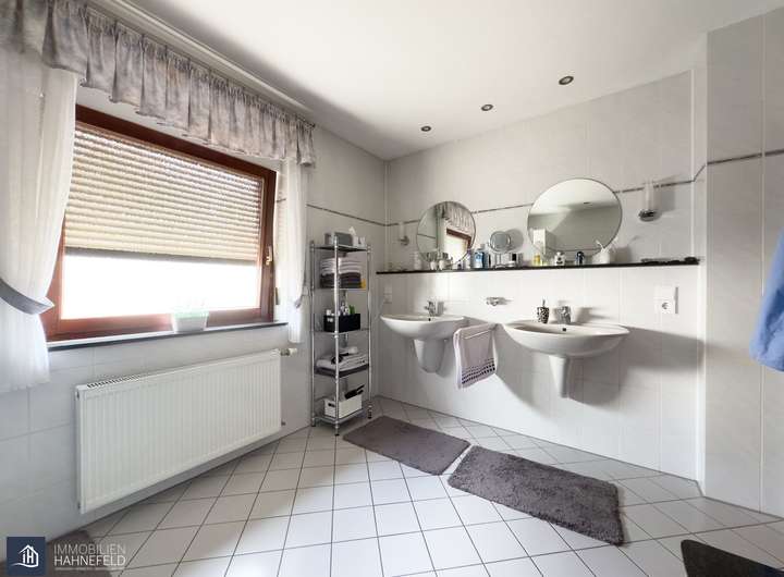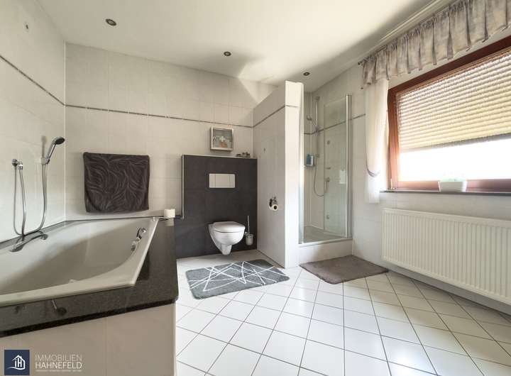 Der einladende Windfang bietet Zugang zu einem Gäste-WC mit Garderobe und führt in das gepflegte Treppenhaus. Der Flur erschließt das modernisierte Badezimmer mit Dusche, Badewanne und Doppelwaschtisch – hell gefliest und mit Armaturen ausgestattet.