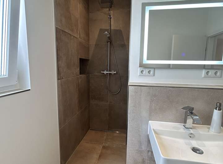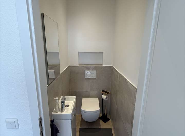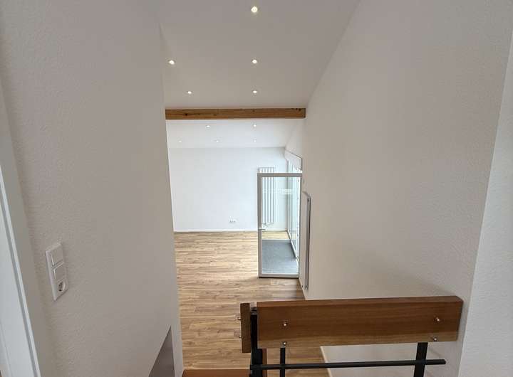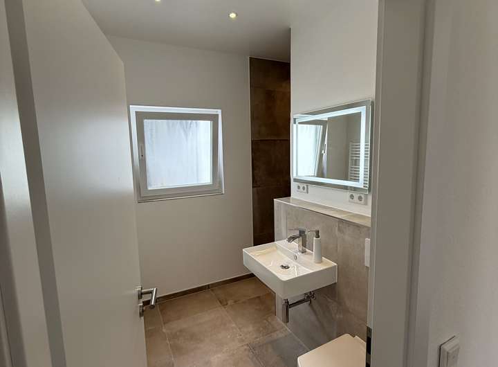 Das große Badezimmer wurde ebenso wie das Gästebad komplett kernsaniert und überzeugt durch modernes Design. Helles Laminat in allen Wohnräumen und eine stilvolle Spotbeleuchtung im gesamten Haus schaffen eine besonders freundliche und elegante Wohnatmosphäre.