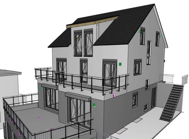 Aktuell genehmigt wurde ein großes Einfamilienhaus mit Einliegerwohnung und 3 Garagen.
