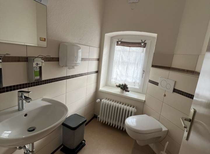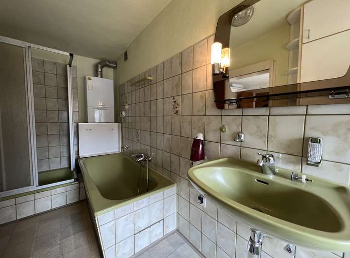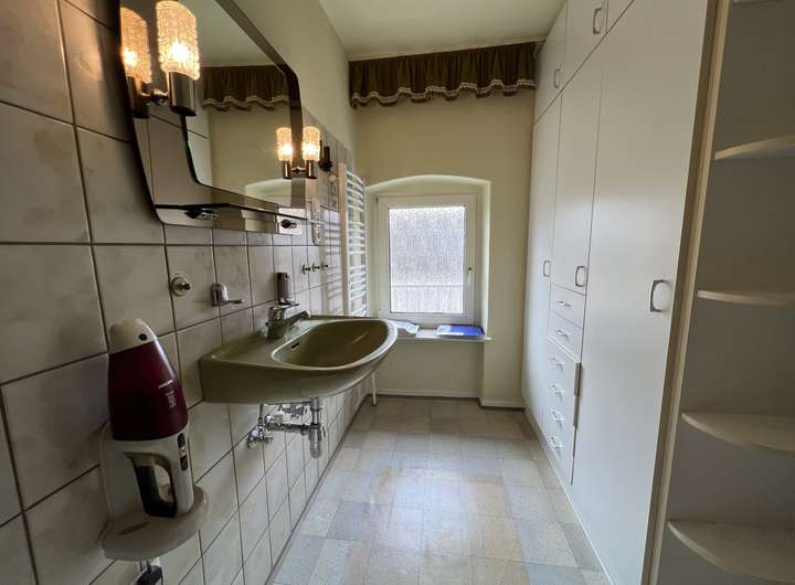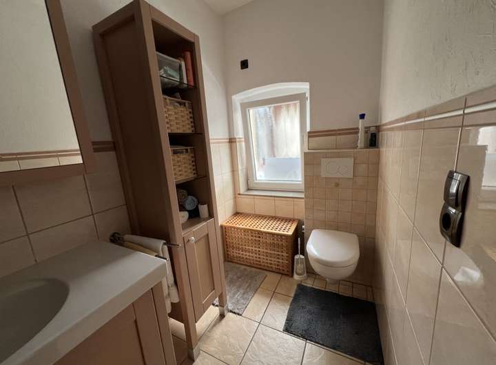 Auch hier ist das Badezimmer mit einer Badewanne, einem Waschbecken sowie einem WC ausgestattet. Das Badezimmer verfügt über ein Lichtfenster zum Treppenhaus.