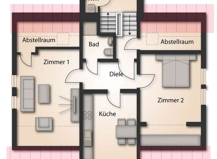 Die letzte der Wohnung befindet sich im Dachgeschoss. Sie bietet zwei Zimmer und verfügt über eine Wohnfläche von ca. 60 m². Auch hier betreten Sie die Wohnung über eine Diele, die den Übergang zwischen den verschiedenen Räumen der Wohnung harmonisch gestaltet. Der Wohnbereich ist angenehm groß und gut geschnitten, das Schlafzimmer ist dank der Holzbalken an der Decke sehr gemütlich, aber nicht klein.