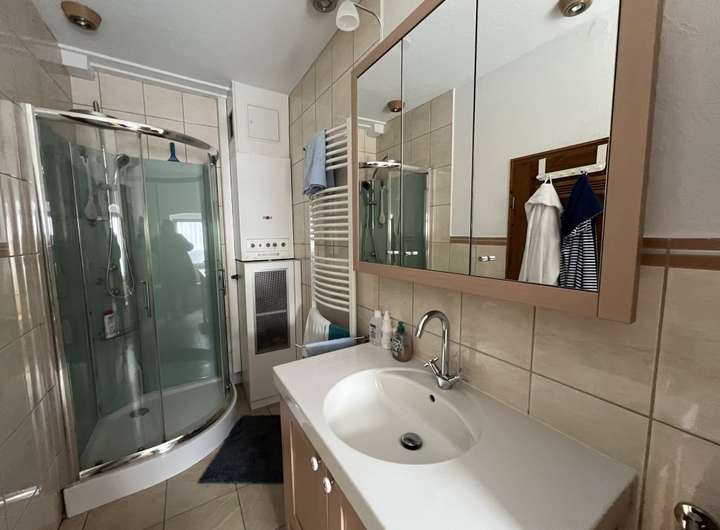 Die Wohnung verfügt weiterhin über ein Schlafzimmer sowie über ein drittes Zimmer, welches gut als Kinder- oder Arbeitszimmer genutzt werden kann. Komplementiert werden die Wohnungen durch ein Badezimmer. Das Badezimmer im 1. Obergeschoss verfügt über eine Dusche, ein Waschbecken und ein WC. Das Badezimmer im 2. Obergeschoss ist mit einer Badewanne, einer Dusche, einem Waschbecken sowie einem Einbauschrank ausgestattet. Hier besteht die Möglichkeit, ein WC zu installieren. Aktuell befindet sich das WC auf einer separaten Etage.