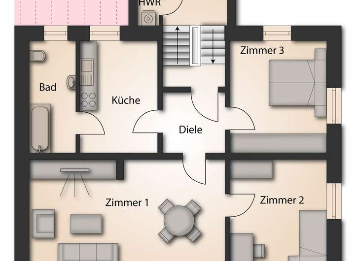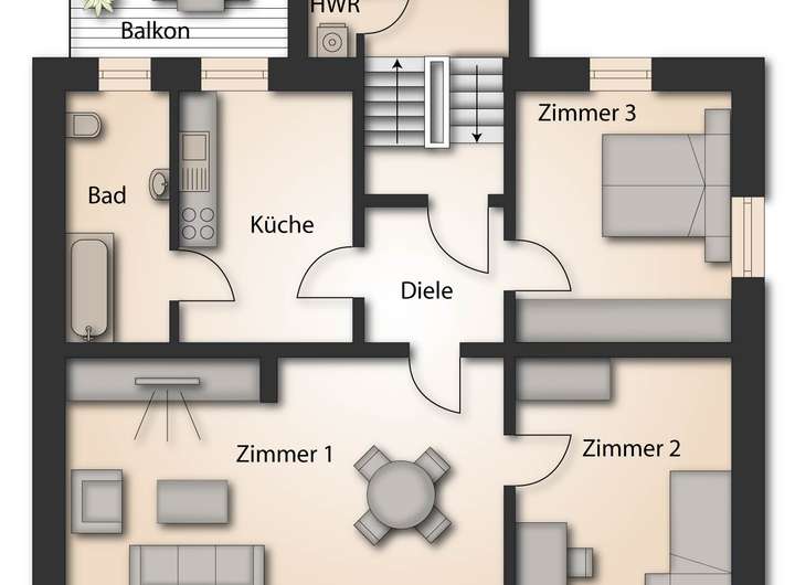 Bei den Wohnungen handelt es sich um 3 Zimmer-Wohnungen. Eine einladende Diele mit Platz für eine Garderobe führt in die Räumlichkeiten. Von hier gelangen Sie weiter in den offenen Wohn- und Essbereich, mit viel Raum für eine gemütliche Sofalandschaft und einen großen Esstisch.