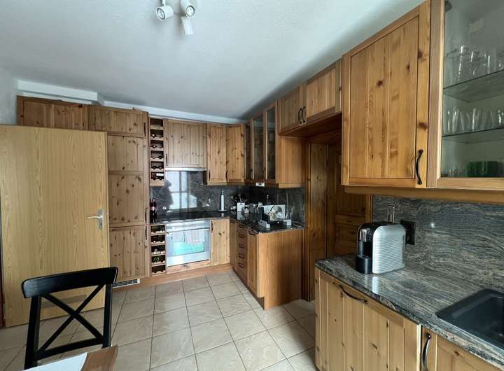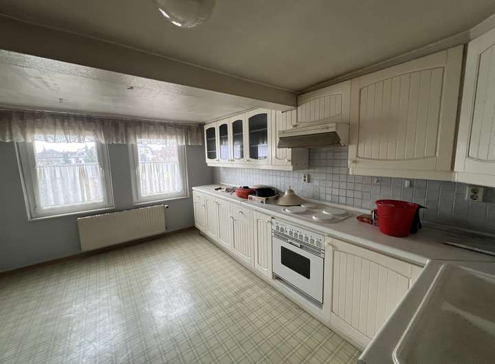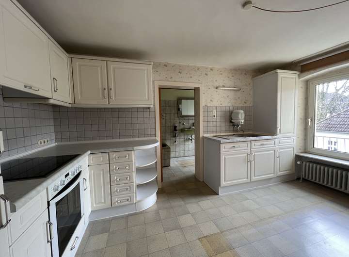 Die Küche befindet sich in einem separaten Raum und bietet ebenfalls zwei Fenster. Eine Einbauküche ist schon vorhanden und mit einem Kochfeld, einem Backofen, einer Spüle sowie einem Kühlschrank ausgestattet.