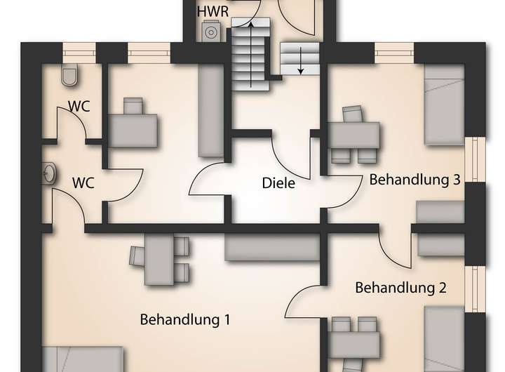 Im Erdgeschoss befindet sich eine großzügige Gewerbeeinheit mit einer Fläche von ca. 82,99 m². Diese bietet zahlreiche Gestaltungsmöglichkeiten für eine medizinische Praxis oder ein Büro. Die Raumaufteilung ermöglicht eine flexible Nutzung.