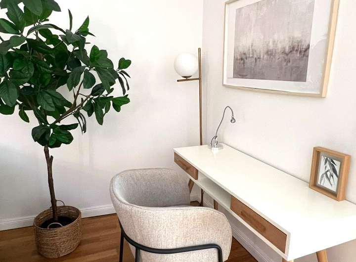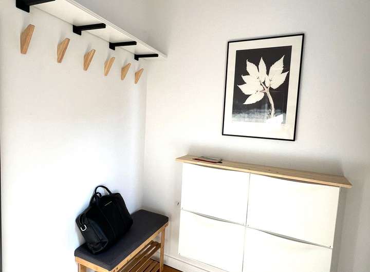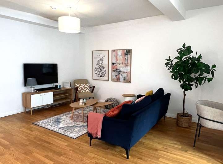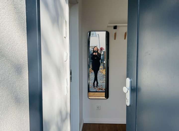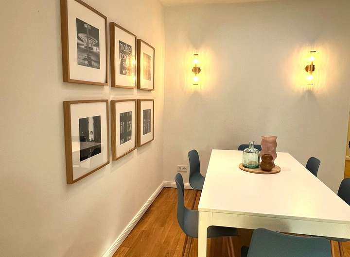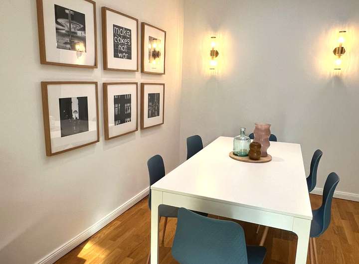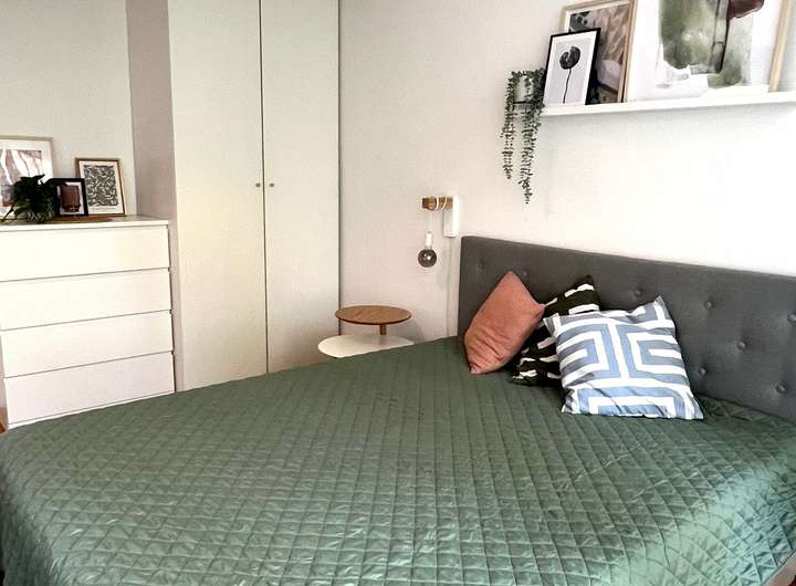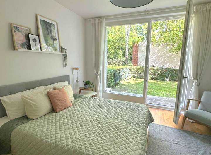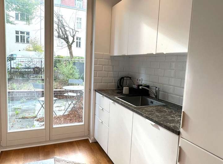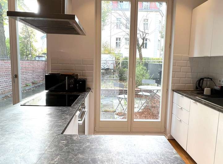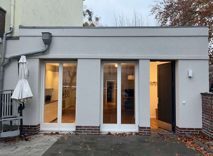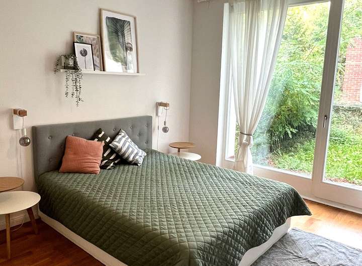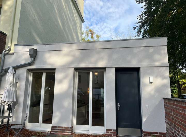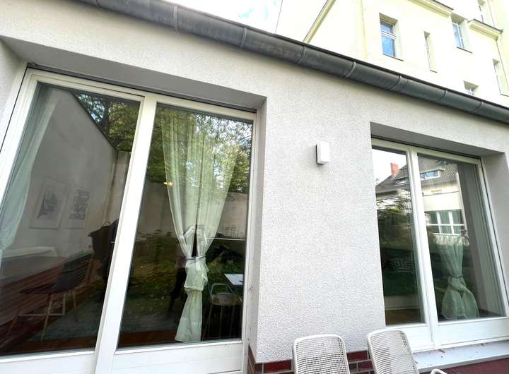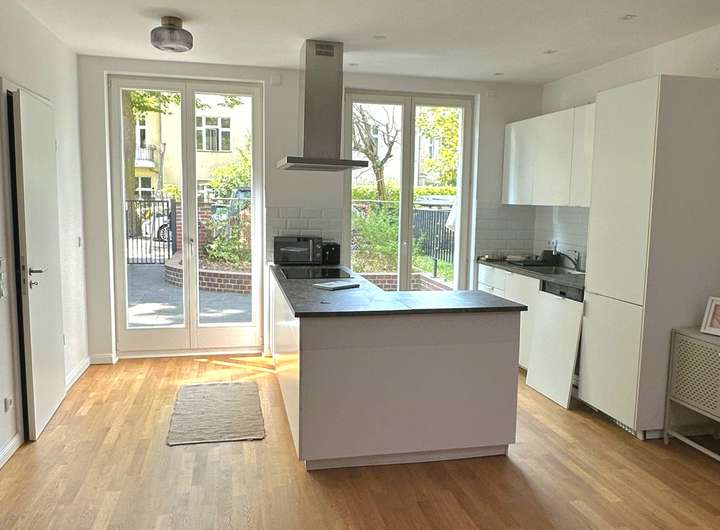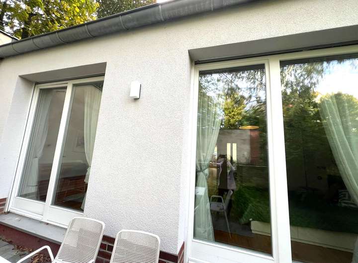 Das Haus ist komplett möbliert und überzeugt mit einem großzügigen, offenen Wohnbereich: Eine moderne Einbauküche, ein stilvoller Essplatz, eine gemütliche Sitzecke und ein Schreibtisch fürs Homeoffice fügen sich harmonisch in einen lichtdurchfluteten Raum. Zwei separate Schlafzimmer mit Zugang zum Garten bieten Ruhe und Rückzug, ergänzt durch ein modernes Bad und einen praktischen Abstellraum mit Waschmaschine. Alle Räume sind ebenerdig und über einen kleinen Flur mit Einbauschrank verbunden. Bodentiefe Fenster, ein eigener Eingang ohne direkte Nachbarn sowie eine große Terrasse vorn und ein kleiner Gartenbereich hinten machen das Wohnen hier angenehm privat und geschützt.