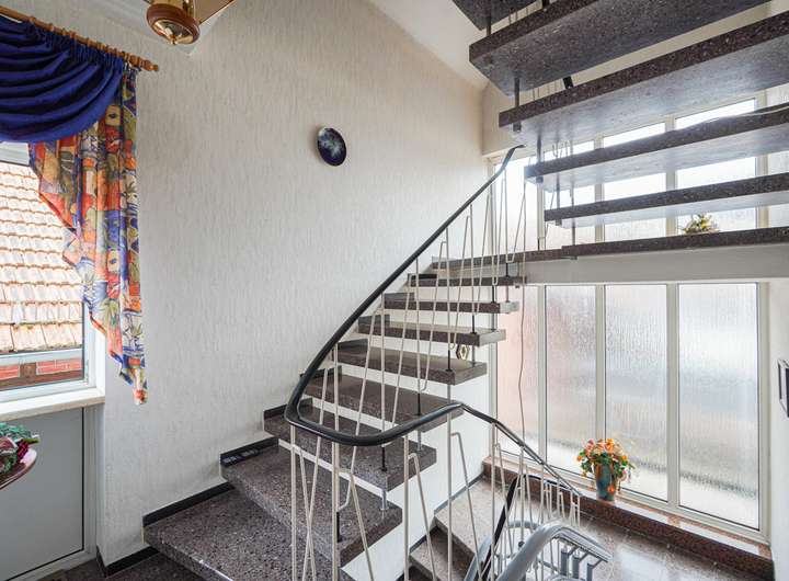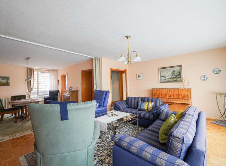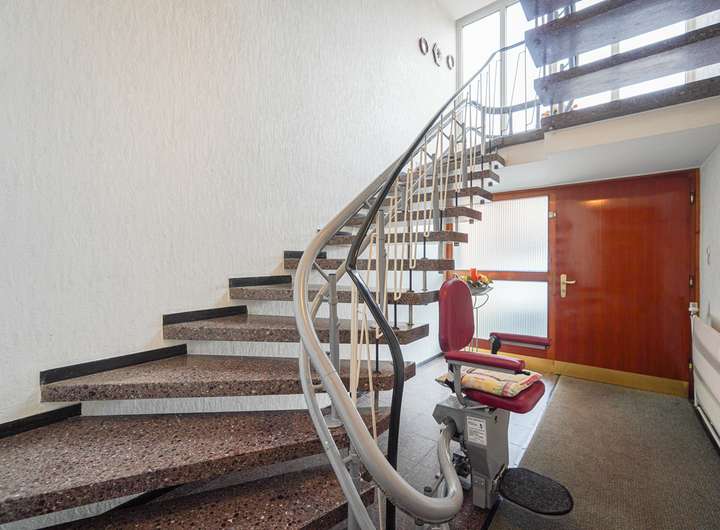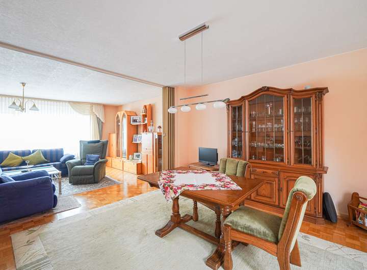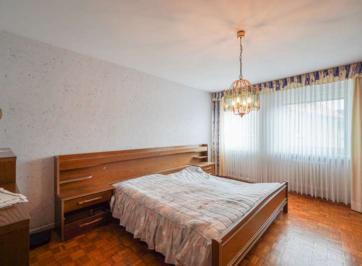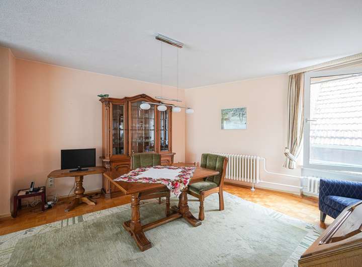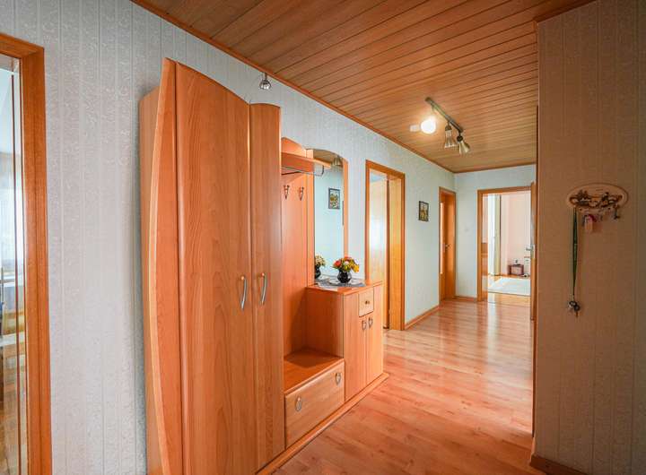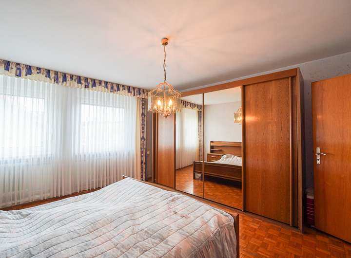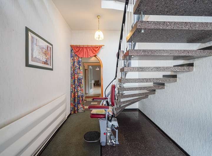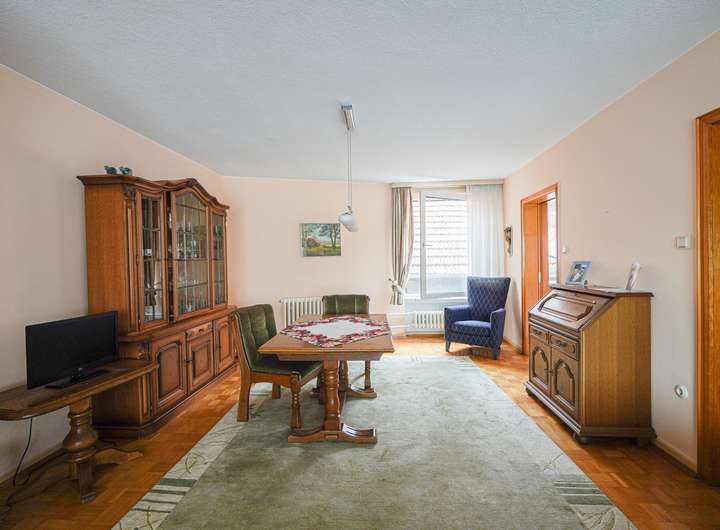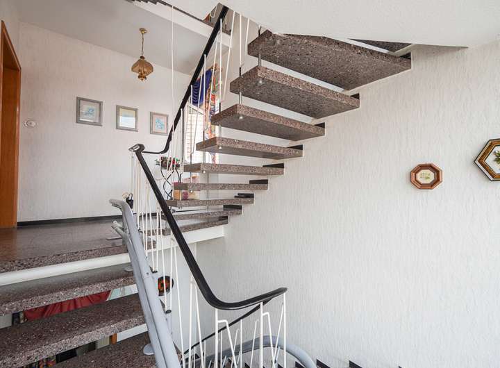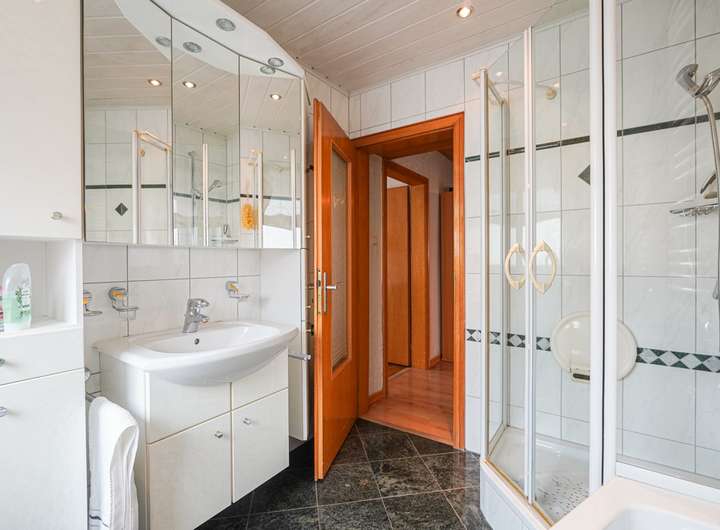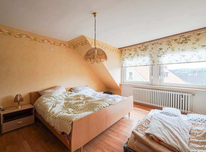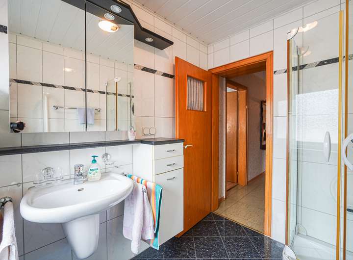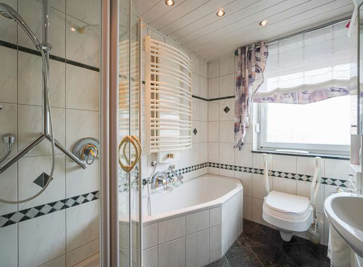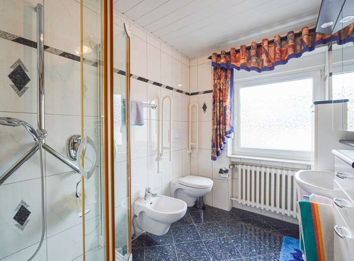 Das Haus ist voll unterkellert und wurde laufend instand gehalten. Die beiden Wohnungen im OG und DG verfügen über insgesamt sieben Zimmer, jeweils ein Bad mit Fenster und gute Lichtverhältnisse. Die Ausstattung umfasst u. a. Fliesen- und Parkettböden. Das Badezimmer im Obergeschoss bietet sowohl Dusche als auch Badewanne, das im Dachgeschoss eine Dusche.