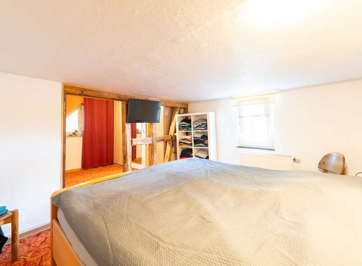 Dieses charmante Fachwerkhaus erzählt seine eigene Geschichte. Ursprünglich als Fachwerkhaus erbaut, wurde es mit den Jahren, letztmals Mitte der 1990er Jahre, mehrfach an- und umgebaut. Umgeben von mehreren Nebengebäuden entfaltet sich hier ein ländliches Idyll mit viel Raum für Ideen: eine große Scheune mit Garagenplätzen und vom Garten aus erreichbarem Lager- oder Hobbyraum sowie ein kleines "Hobbywerkstatt-Gebäude". Das Grundstück ist ein verwunschener Rückzugsort – liebevoll eingewachsen, mit lauschigen Ecken, einem kleinen Pool für warme Tage und einem überdachten Sitzplatz, der zu langen Abenden im Freien einlädt. Das Hausgrundstück ist 651 m² groß. Ein zusätzliches Gartengrundstück mit 394 m², im Ortskern gelegen, wird mitverkauft und ist im Preis enthalten. Im Inneren setzt sich der besondere Charakter fort. Das Erdgeschoss öffnet sich in einen großzügigen, Küchen- und Essbereich mit offenem Ambiente und einem lichtdurchfluteten Wohnbereich – ein Ort, an dem sich Familienleben und Kommunikation ganz natürlich entfalten. Im Obergeschoss bieten drei Zimmer sowie ein großer zentraler Raum vielseitige Nutzungsmöglichkeiten – vom Kinder- oder Gästezimmer bis hin zum ruhigen Arbeitsbereich. Und wenn man noch eine Etage weiter nach oben steigt, gelangt man in das ausgebaute Dachgeschoss – ein Rückzugsort mit ganz eigenem Flair. Ob als Bibliothek, Hobbyraum oder Fitnessbereich: Hier oben genießt man nicht nur Ruhe, sondern auch einen herrlichen Ausblick über die Umgebung. Hier bekommen Sie ein Zuhause, das mehr ist als nur vier Wände – ein Ort mit Charakter, der darauf wartet, mit neuem Leben gefüllt zu werden.