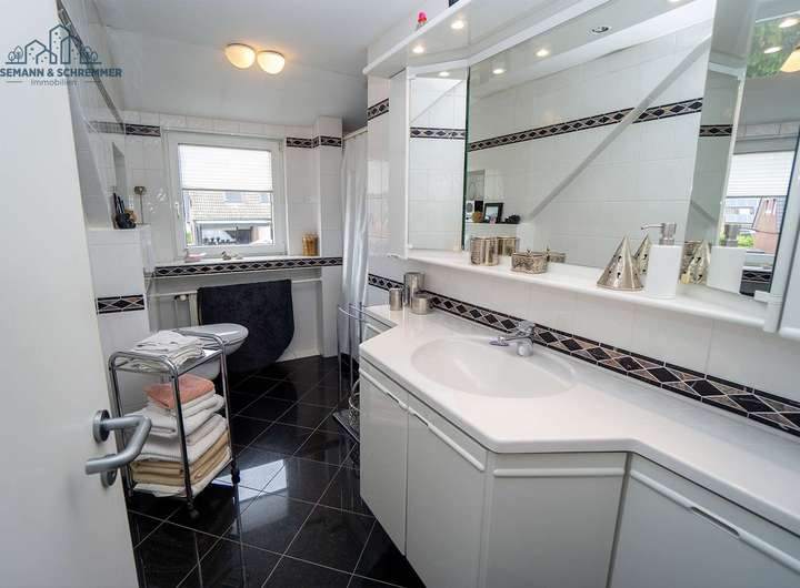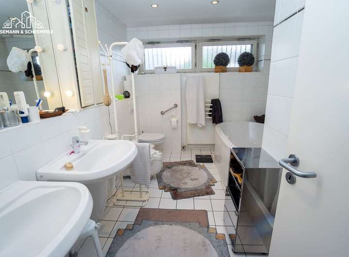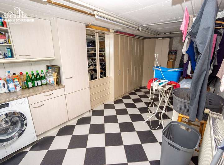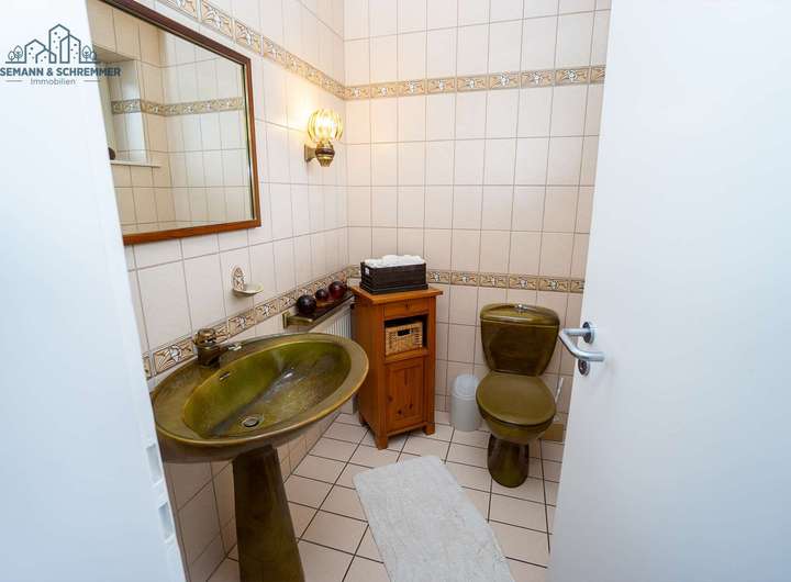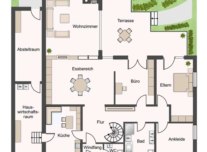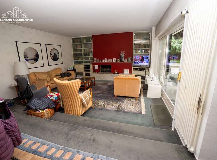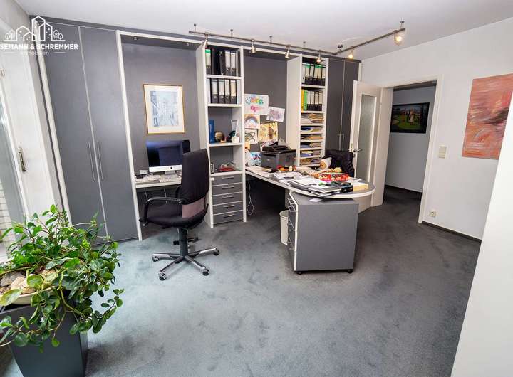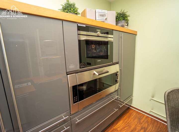 Im Erdgeschoss befinden sich ein großzügiger Wohn- und Essbereich mit Kamin, eine separate Küche mit hochwertigen Geräten (u.a. Gaggenau-Backofen), ein Schlafzimmer mit Ankleide, ein Büro, ein Tageslichtbad, Gäste-WC sowie ein Hauswirtschafts- und Abstellraum. Ein angebauter Geräteschuppen ist von außen zugänglich.
