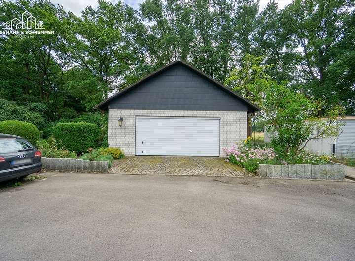 Die separate Doppelgarage bietet zusätzlichen Stauraum durch einen begehbaren Spitzboden.