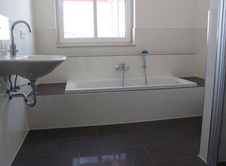 Über eine Buchenholztreppe gelangt man vom Flur aus in das Obergeschoss. Hier befinden sich drei Schlafzimmer und ein Vollbad mit Fenster, Wanne und bodengleicher Dusche.