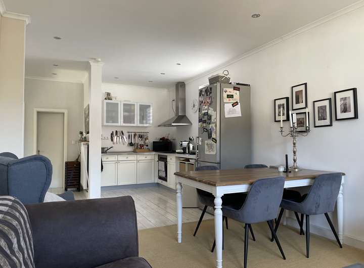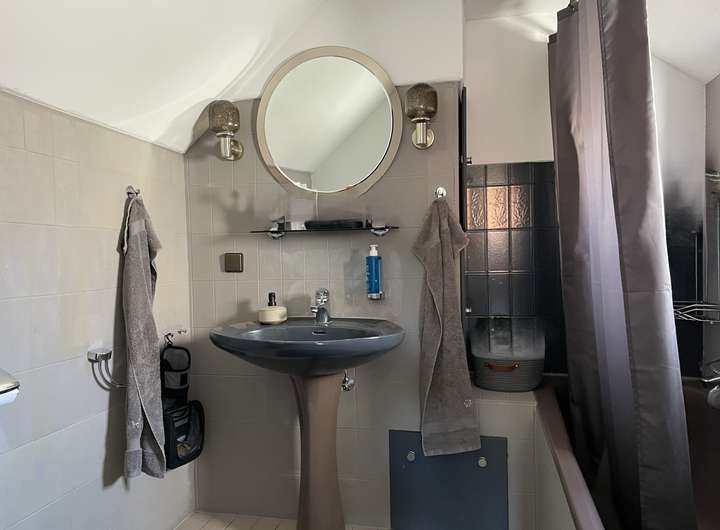 Die zweite Wohneinheit erstreckt sich über das Ober- und ausgebaute Dachgeschoss mit ca. 80 m² Wohnfläche. Hier wurde zwischen 2016 und 2022 umfassend renoviert: Ein offener Wohn- und Essbereich mit integrierter Küche, ein modernes Badezimmer, ein Schlafzimmer sowie ein Kinderzimmer oder Home-Office bieten attraktiven Wohnkomfort. Das Dachgeschoss ist zu einem großen, hellen Raum ausgebaut und flexibel nutzbar – etwa als Schlafzimmer, Studio oder Arbeitsbereich.
