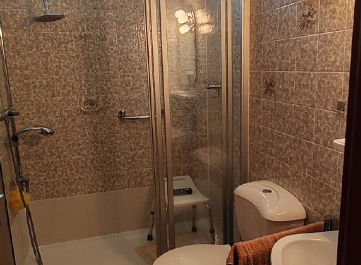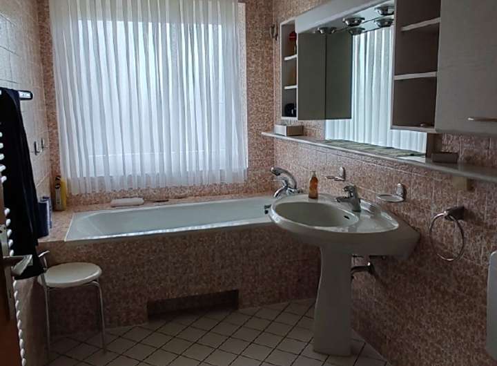 Aus der Diele gelangen Sie auch in den separaten Schlaftrakt, der aus 3 Schlafzimmern, einem bereits modernisierten Gäste WC mit großer Dusche und einem weiteren Badezimmer besteht. Aktuell sind braune Kunststofffenster mit Isolierverglasung verbaut. Die Fußböden variieren von Teppichböden und Fliesen, wobei im Keller Fliesenböden sich mit PVC-Böden abwechseln.