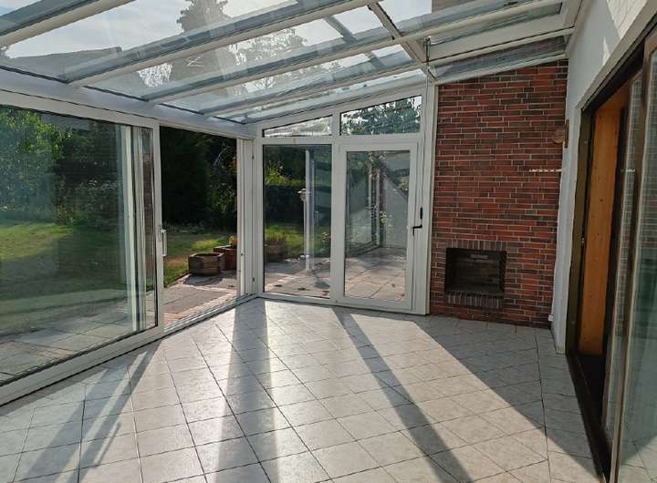 An den Essplatz angrenzend befindet sich die vorgelagerte Küche. An der Südseite des Gebäudes befindet sich der ca. 22m² große Wintergarten, der über 3 große Hebe-Schiebeelemente zum Öffnen verfügt. Dadurch wird ein Gefühl erzeugt, direkt im angerenzenden Garten zu sitzen. An Sonnentagen kann auf der gesamten Breite eine Sonnenbeschattung herausgefahren werden.
