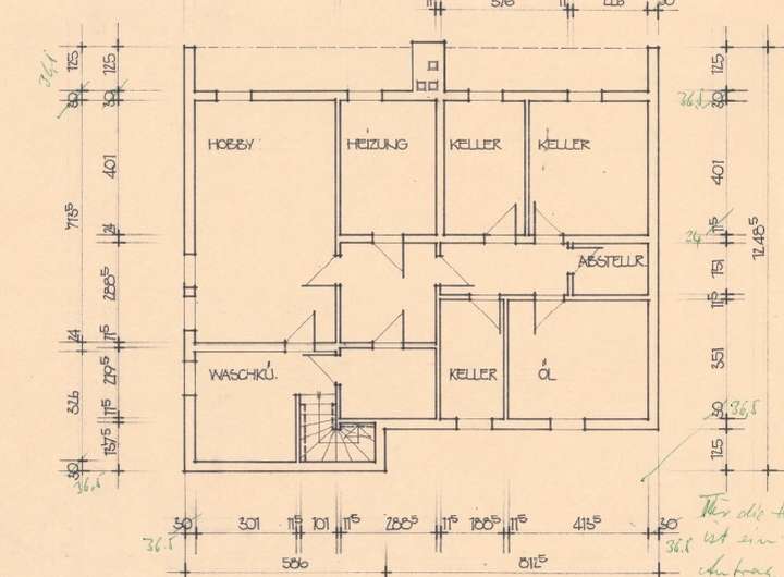 Aus dem Windfang gelangen Sie über eine massive Treppe das Kellergeschoss. Ein großes Besucherzimmer, ein Waschkeller, mehrere Abstellräume, die Ölzentralheizung aus dem Jahr 2007 und der große Ölraum ist hier untergebracht. Dort befindet sich ein kellergeschweißter Öltank mit einem Fassungsvermögen von über 7.000 Litern.