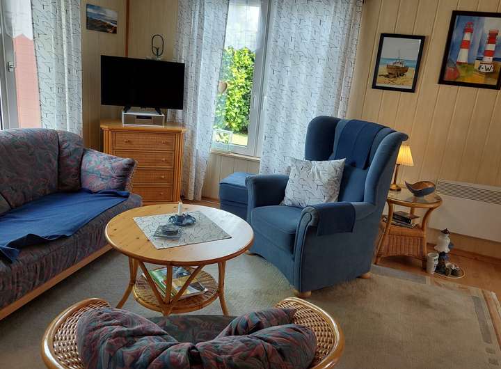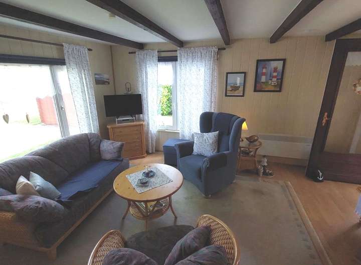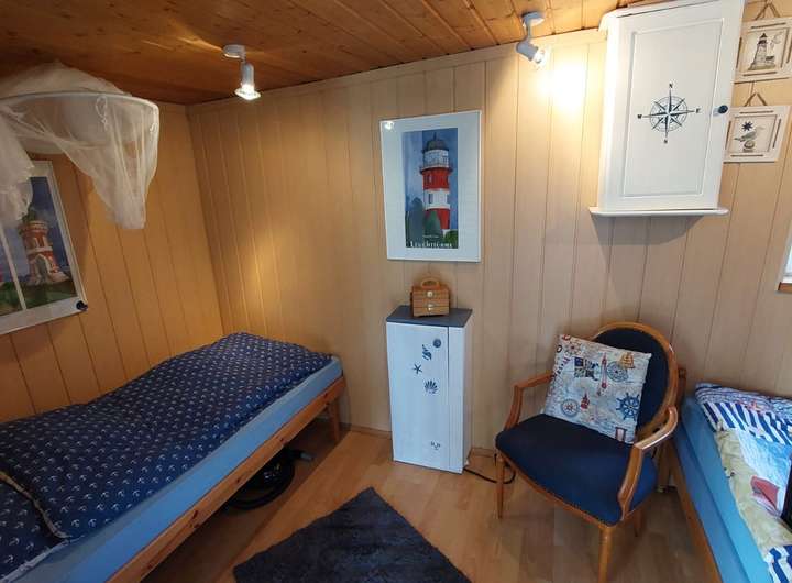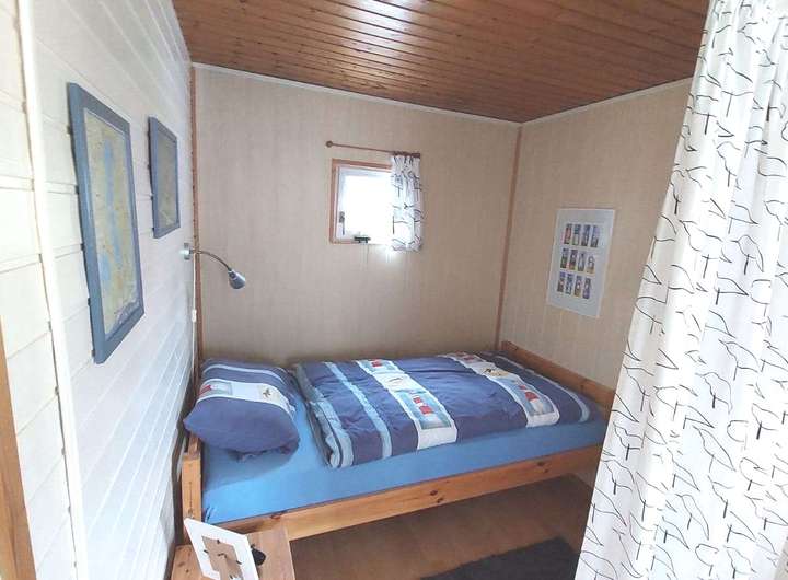 Von der Küche aus gelangt man ins Schlafzimmer, wo derzeit 2 Einzelbetten stehen. Auch das Wohnzimmer ist von der Küche aus zu betreten. Durch die 4 Fenster ist auch das Wohnzimmer schön hell. Es ist geräumig und bietet eine angegliederte Schlafkoje, so dass für Kinder oder Gäste ausreichend Schlafplatz vorhanden ist.