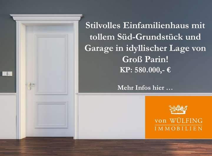 Stilvolles Einfamilienhaus mit tollem Süd-Grundstück und Garage in idyllischer Lage von Groß Parin! Dieses großzügige Einfamilienhaus in idyllischer Wohnlage von Groß Parin bietet Ihnen hohen Wohnkomfort in naturnaher, ruhiger Lage. Die sehr gelungene Raumaufteilung bietet besonders Familien ausreichend Platz zur Verwirklichung ihres Wohntraums.