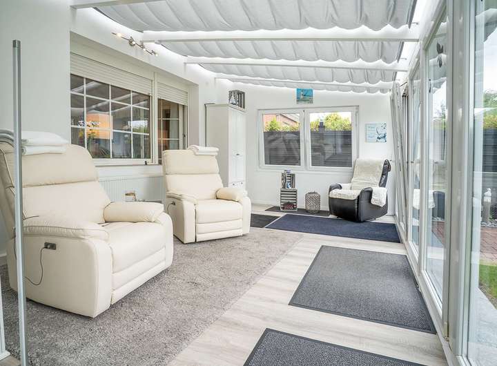 Ein besonderes Highlight: Vom Wintergarten führt der Weg direkt in die ausgebaute Garage, die derzeit als zusätzlicher Gästebereich genutzt wird, baurechtlich jedoch nicht zu Wohnzwecken genehmigt ist. Hier stehen eine große, ebenerdige Dusche, ein kleiner Wohn- und Schlafbereich sowie eine integrierte Küchenzeile zur Verfügung.