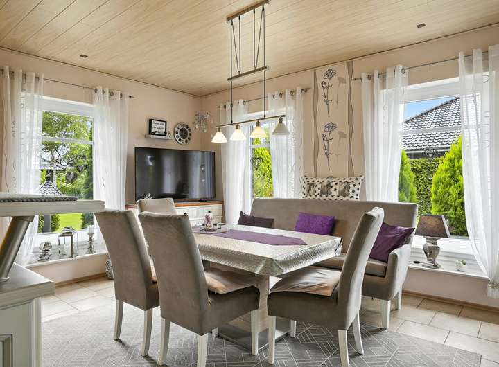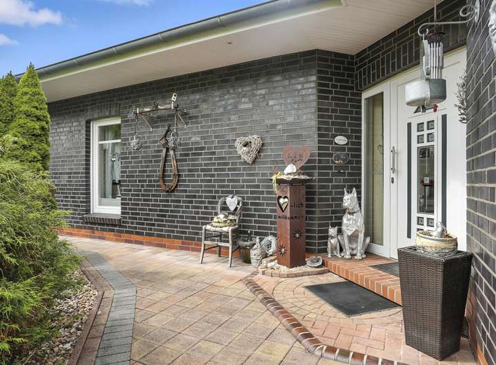 Dieser modern konzipierte Bungalow überzeugt durch eine gelungene Kombination aus durchdachter Architektur, großzügiger Raumaufteilung und hochwertiger Ausstattung – eingebettet in ein gepflegtes, naturnahes Grundstück.