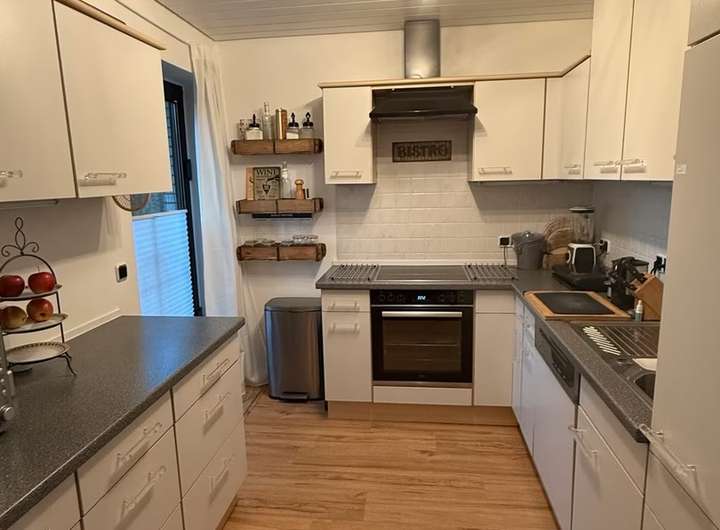 An den Essbereich schließt sich die Küche an , welche durch eine Schiebetür geschlossen werden kann. Die Küche verfügt zudem über eine Tür nach draußen zum Einstellplatz/ Garage , so kann der Einkauf auf kurzem Wege direkt in die Küche gelangen.