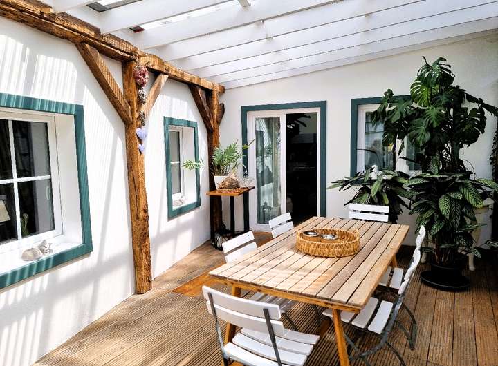 Die Sanierung wurde mit größter Sorgfalt und einem Auge für architektonische Details durchgeführt. Die charakteristische Fachwerkstruktur wurde erhalten und mit modernen Elementen harmonisch kombiniert.