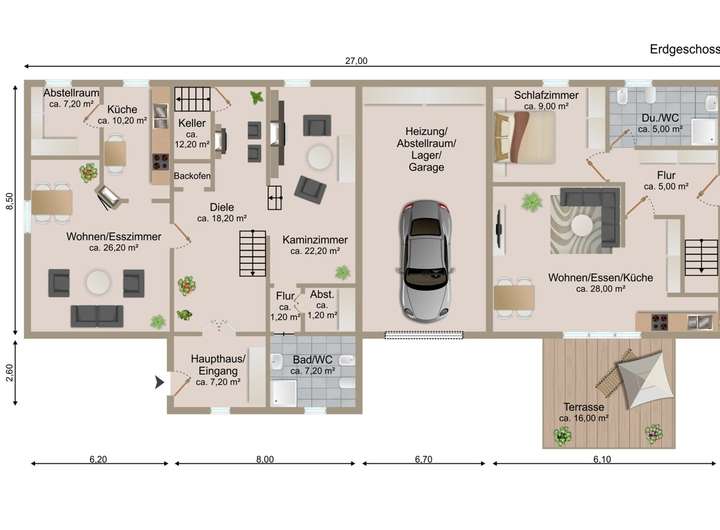 Vor dem ca. 230 m²-Bruttogeschossfläche-großen Haupthaus, steht ein verglaster
