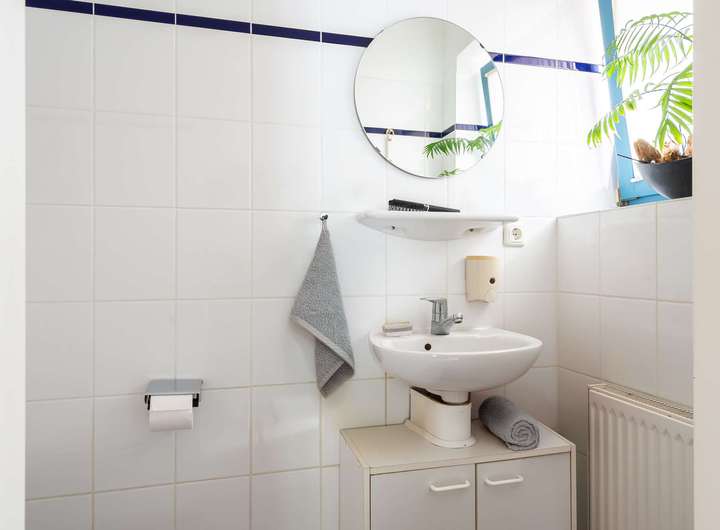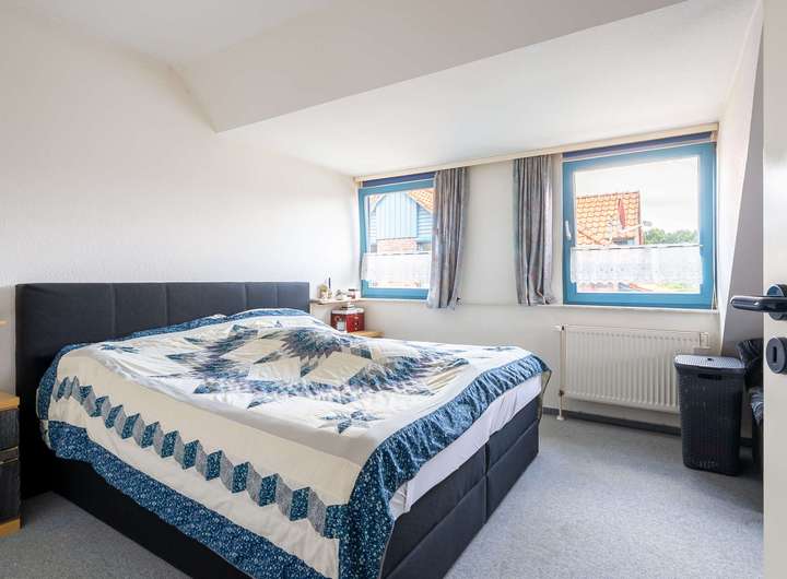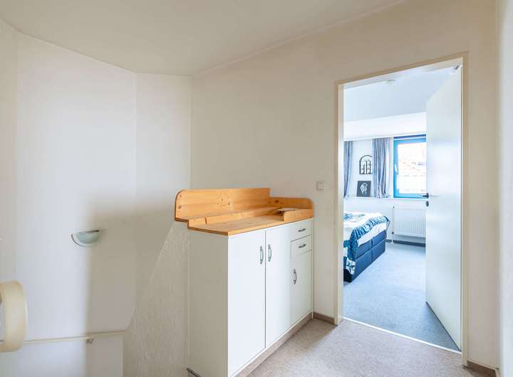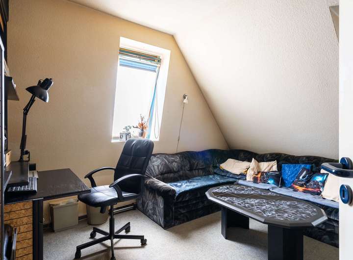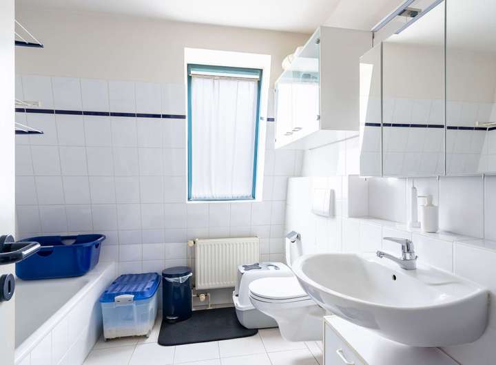 Im Obergeschoss stehen drei individuell nutzbare Zimmer zur Verfügung, die sich je nach Bedarf als Schlaf-, Kinder- oder Arbeitszimmer eignen. Das helle Tageslichtbad überzeugt durch eine durchdachte Ausstattung mit Dusche, Badewanne, zwei Waschtischen und WC.